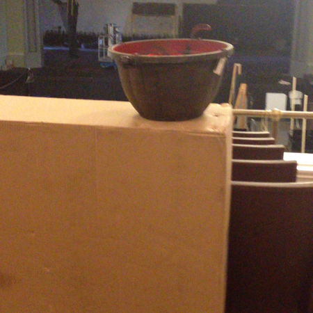 All of the lighting elements had a small amount of 5lb velcro attached to it, and a corresponding piece set into the bowl, so each element could be firmly affixed during use. The lighting elements consisted of several strips of RGB LED tape, a Look Solutions mini-fogger with a radio control receiver, a 4-channel wireless dimmer from RC4 Wireless, and a 12v drill battery to power the dimmer and LED tape. The wireless dimmer allowed the Lighting Designer to program a fire chase effect onto the LEDs that was controllable through the lighting console, as well as control the mini fan, located at the bottom of the bowl set to blow air upward. When an ASM located backstage triggered the mini-fogger, smoke with begin billowing upward, which looked like fire glowing in the bowl.